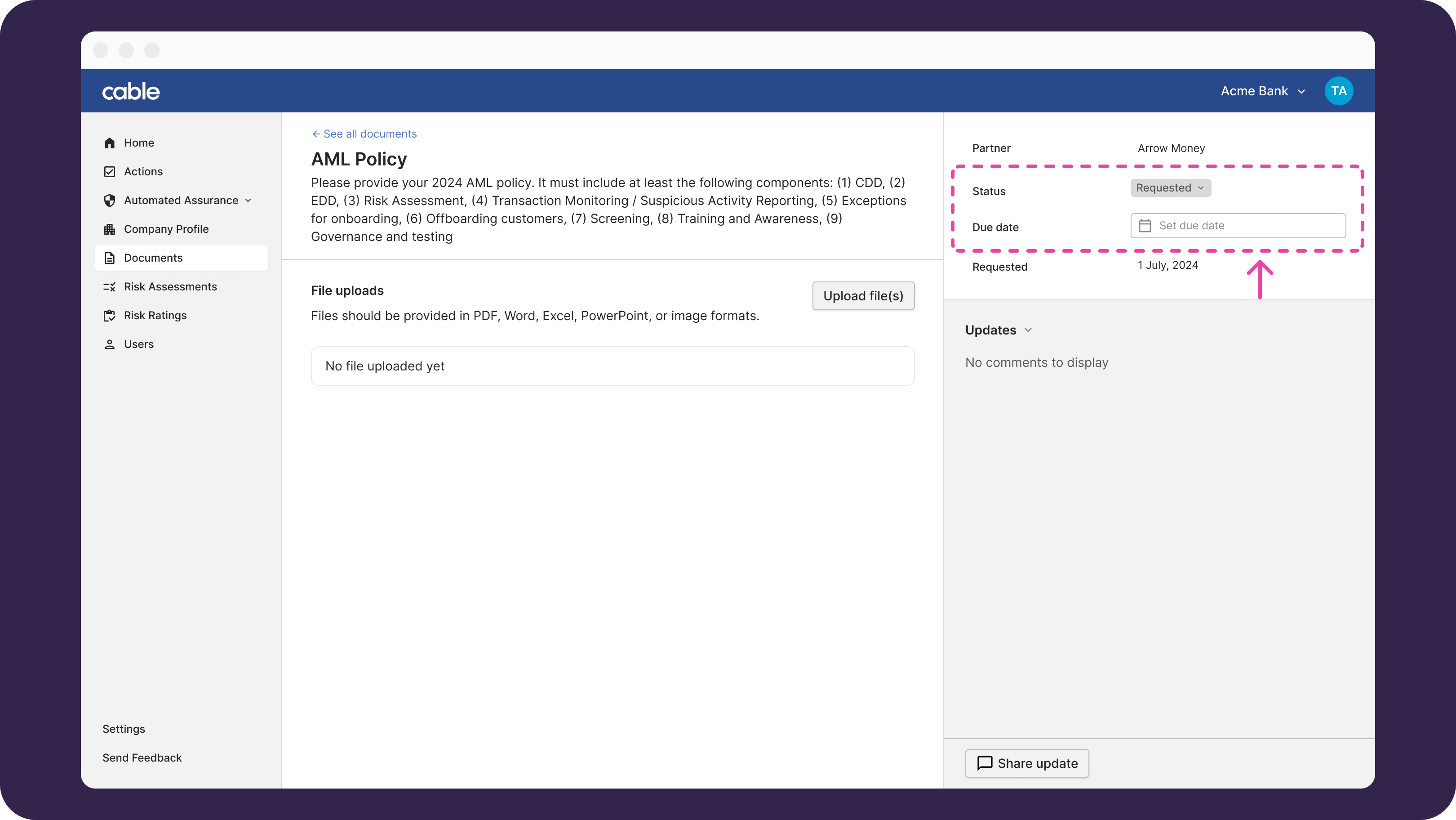 Your partner can upload as many documents as relevant, update status, and notify you when the request is complete.