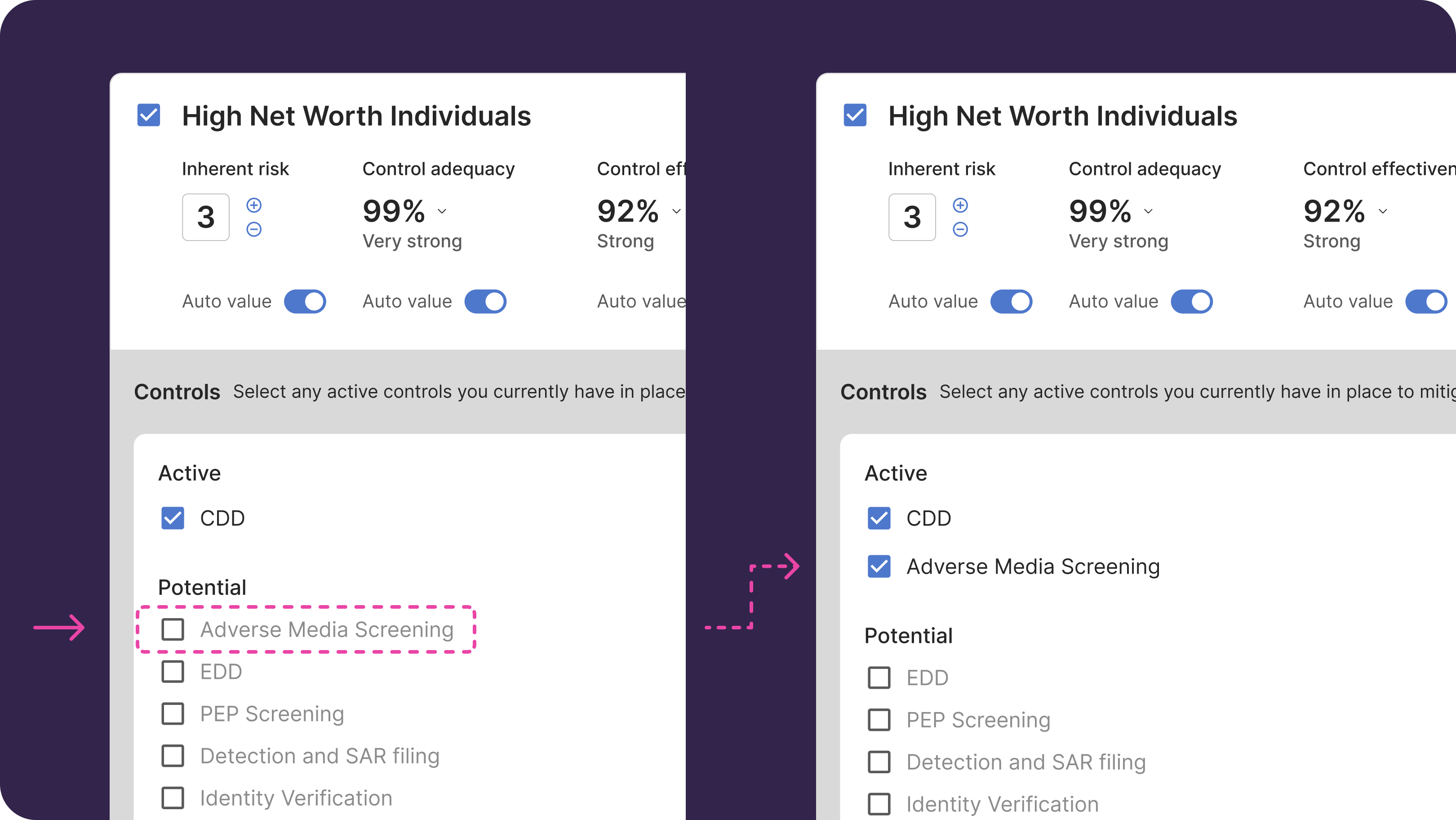 - For each Risk, we’ll suggest potential Controls that are common for that Risk — you should indicate which Controls you have in place for the Risk by ticking the box next to each Control to move it to the “Active” Controls list.