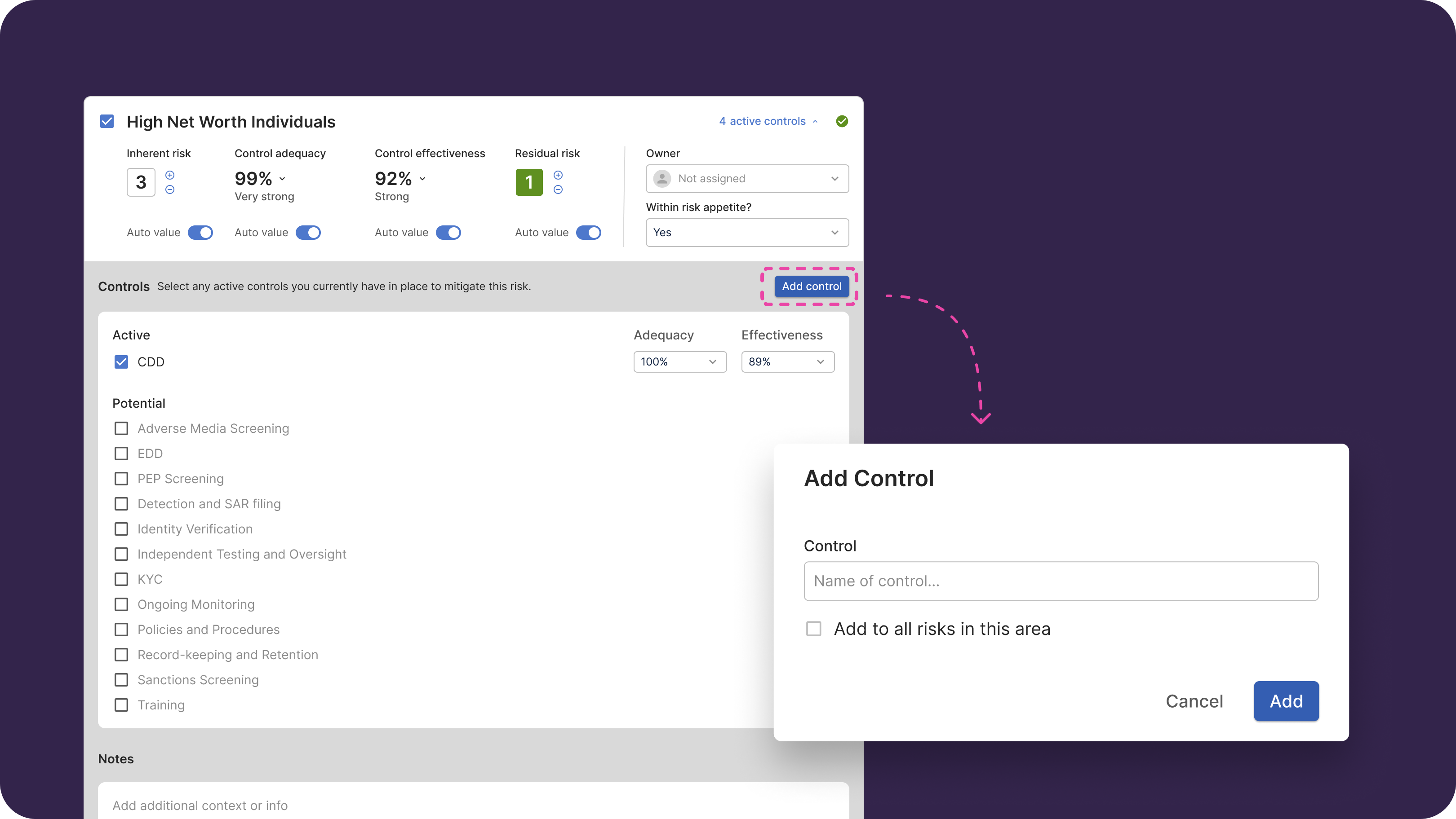 - For each Risk, you can provide additional context or information about your controls by adding notes under the Notes section below all the controls. The notes can also be edited or deleted.