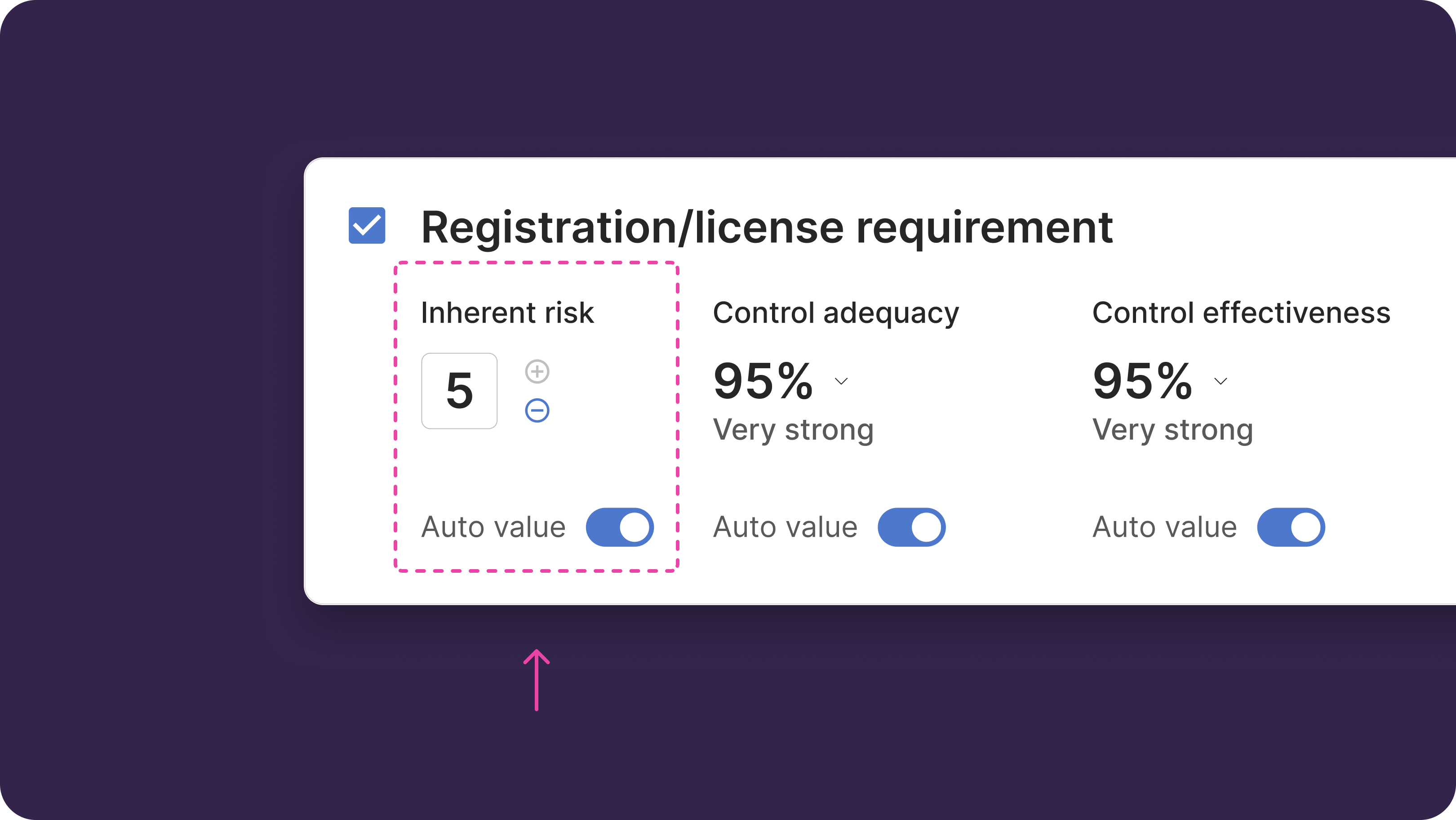 - We suggest an Inherent Risk score based on your questionnaire responses. Additionally, based on your Controls input (see more on this below), we calculate Control Adequacy, Control Effectiveness, and Residual Risk values.