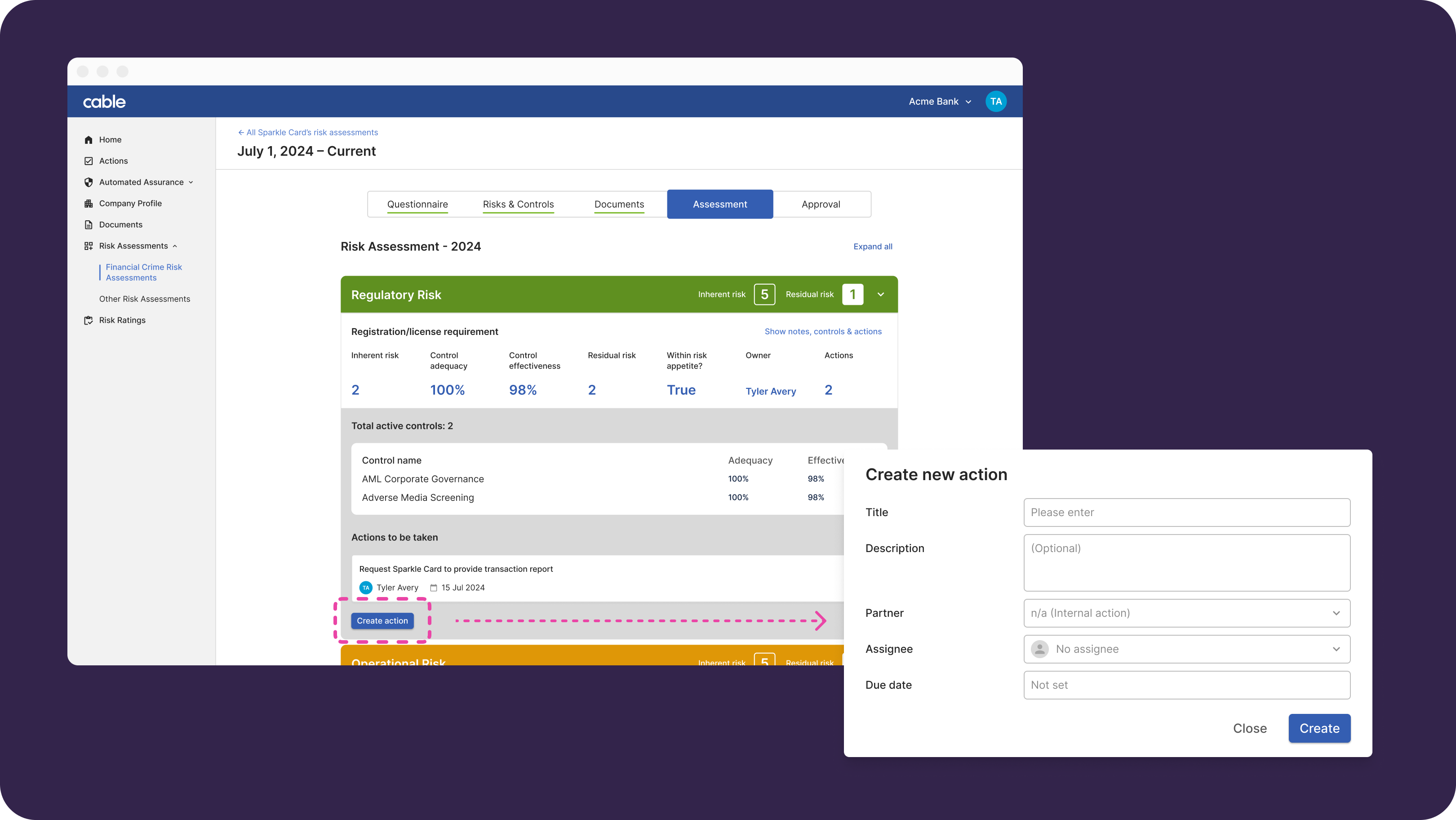 - Add Actions tied to specific risks, which will be tracked in the Actions tab on the left sidebar. Expand the risk you want to add an action for and click “show notes, controls & actions” and “create action”