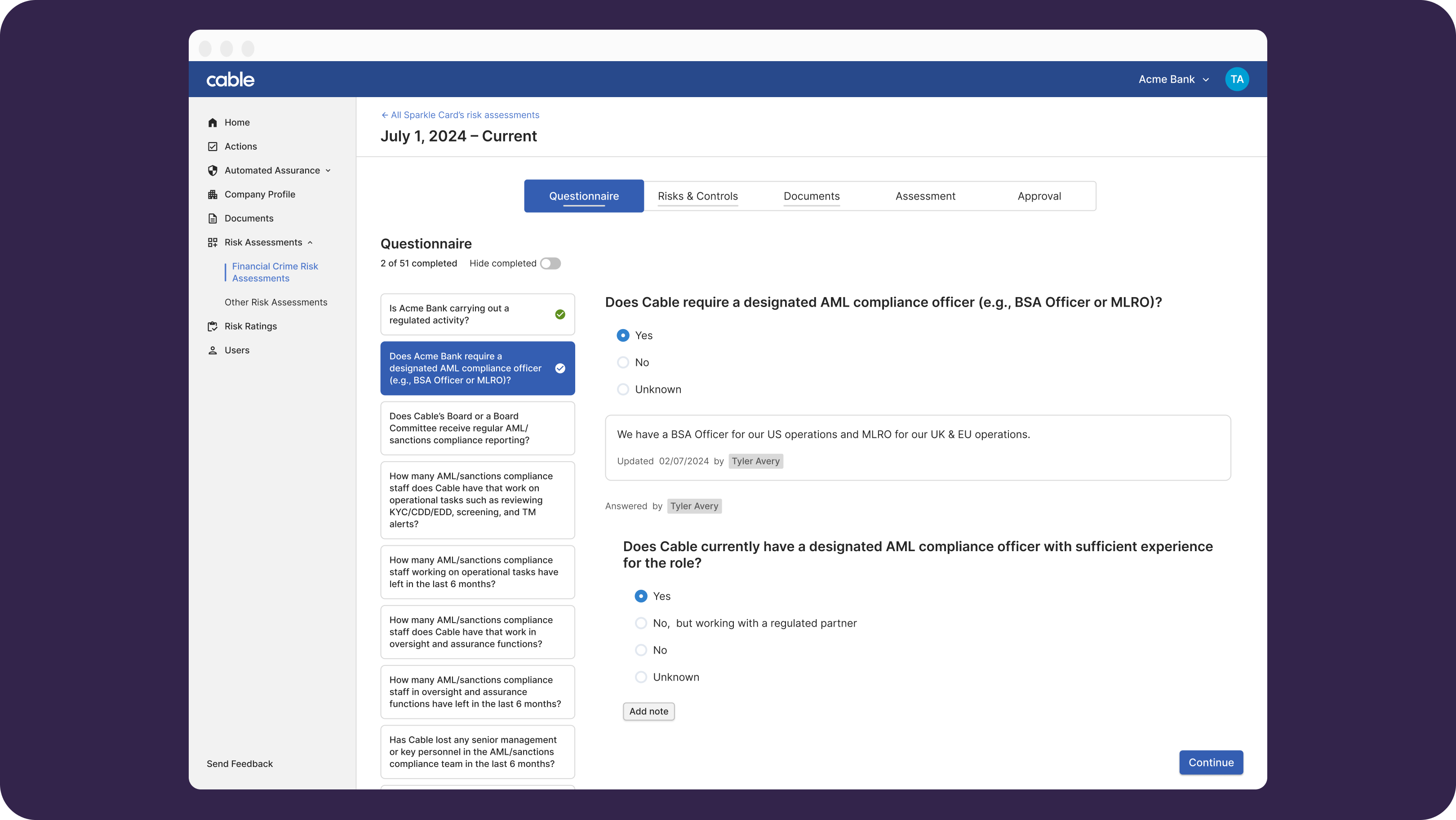 As you’re answering the questions, there can be additional conditional questions that will be prompted based on your answers to prior questions. You will also have the ability to add notes to provide additional context to your answers. The notes can also be edited or deleted.