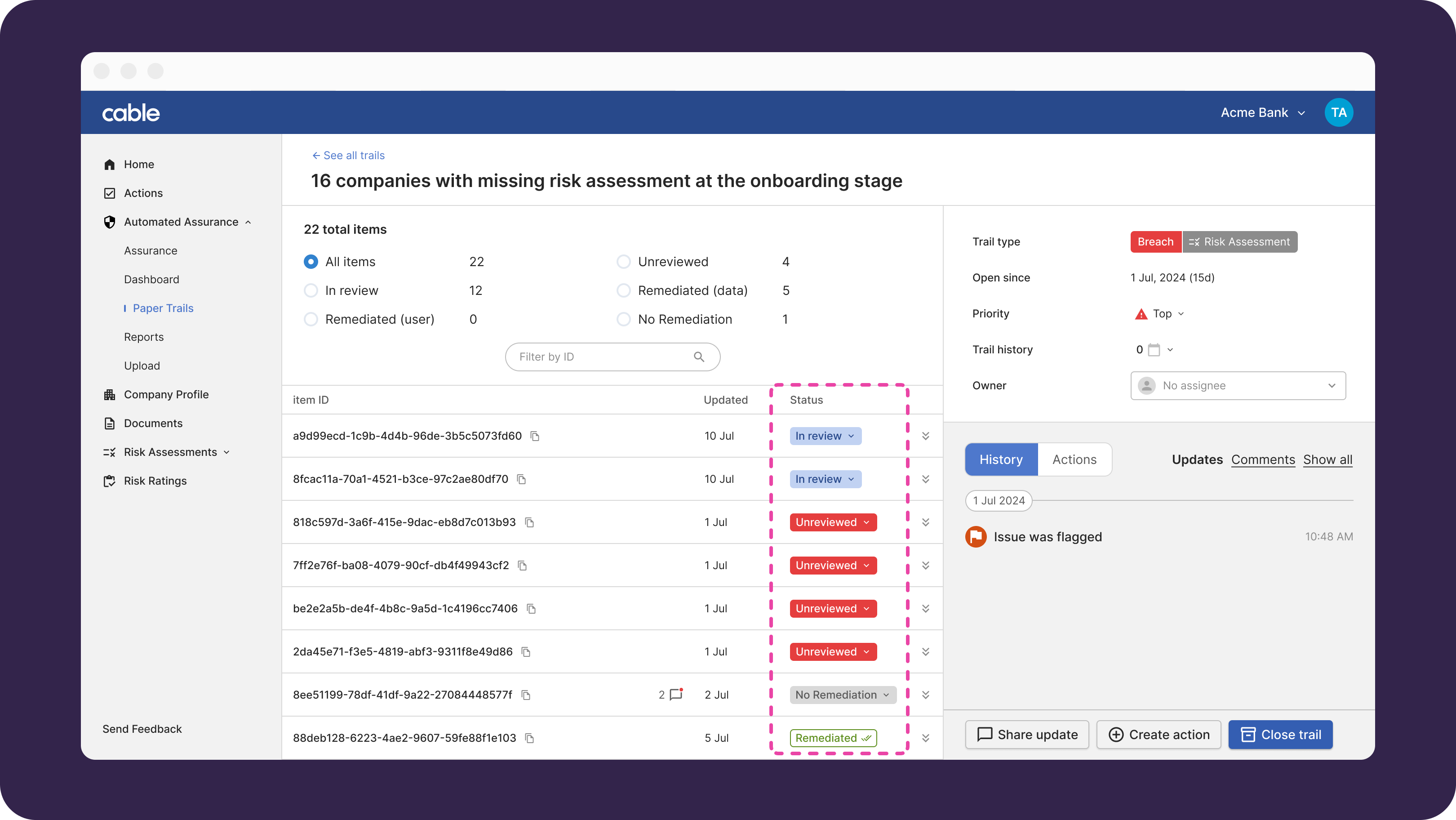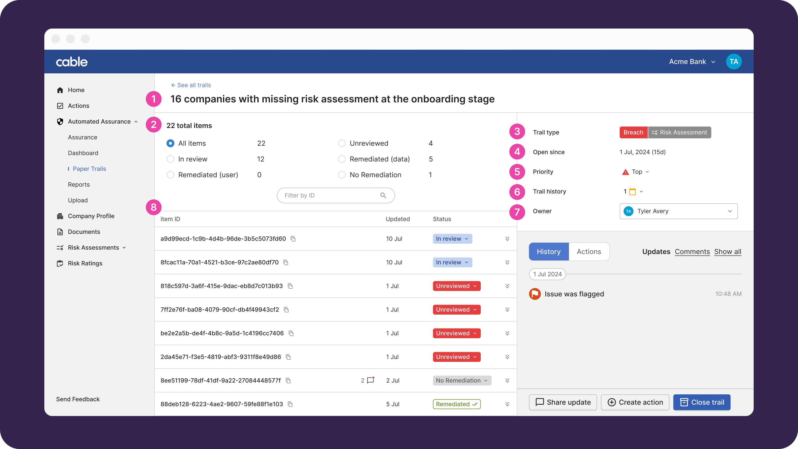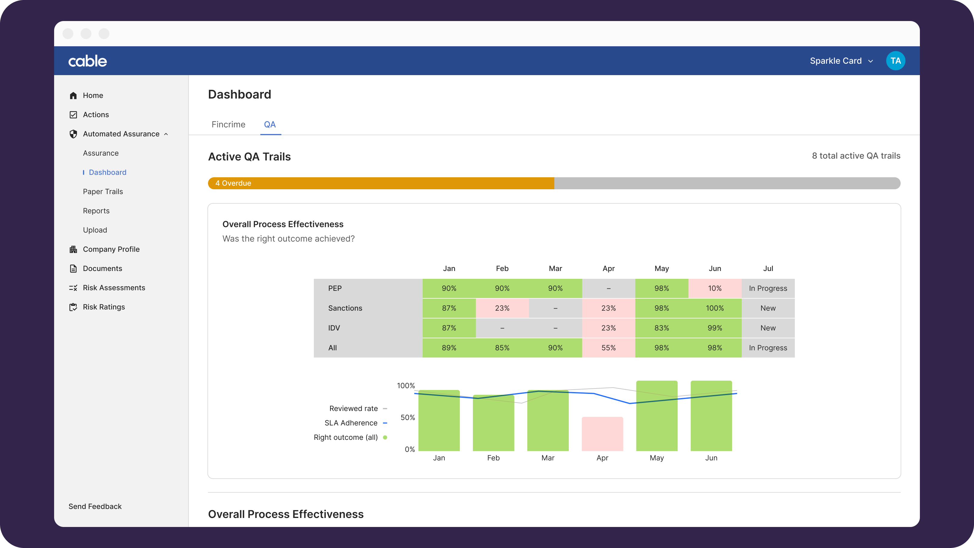 If we find any, we surface them for you as “Trails” in the Cable web app. The “Assurance page” provides you with a real-time view of your financial crime health.