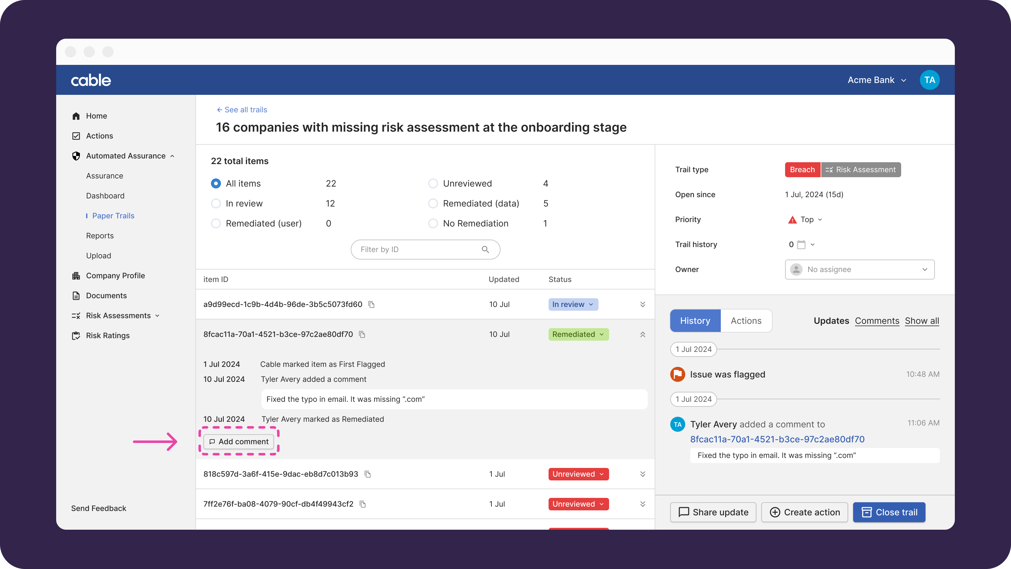 If Cable identifies any issues as a result of automated testing, then these are surfaced in the “Paper Trails” section in the Cable app for your team to investigate.