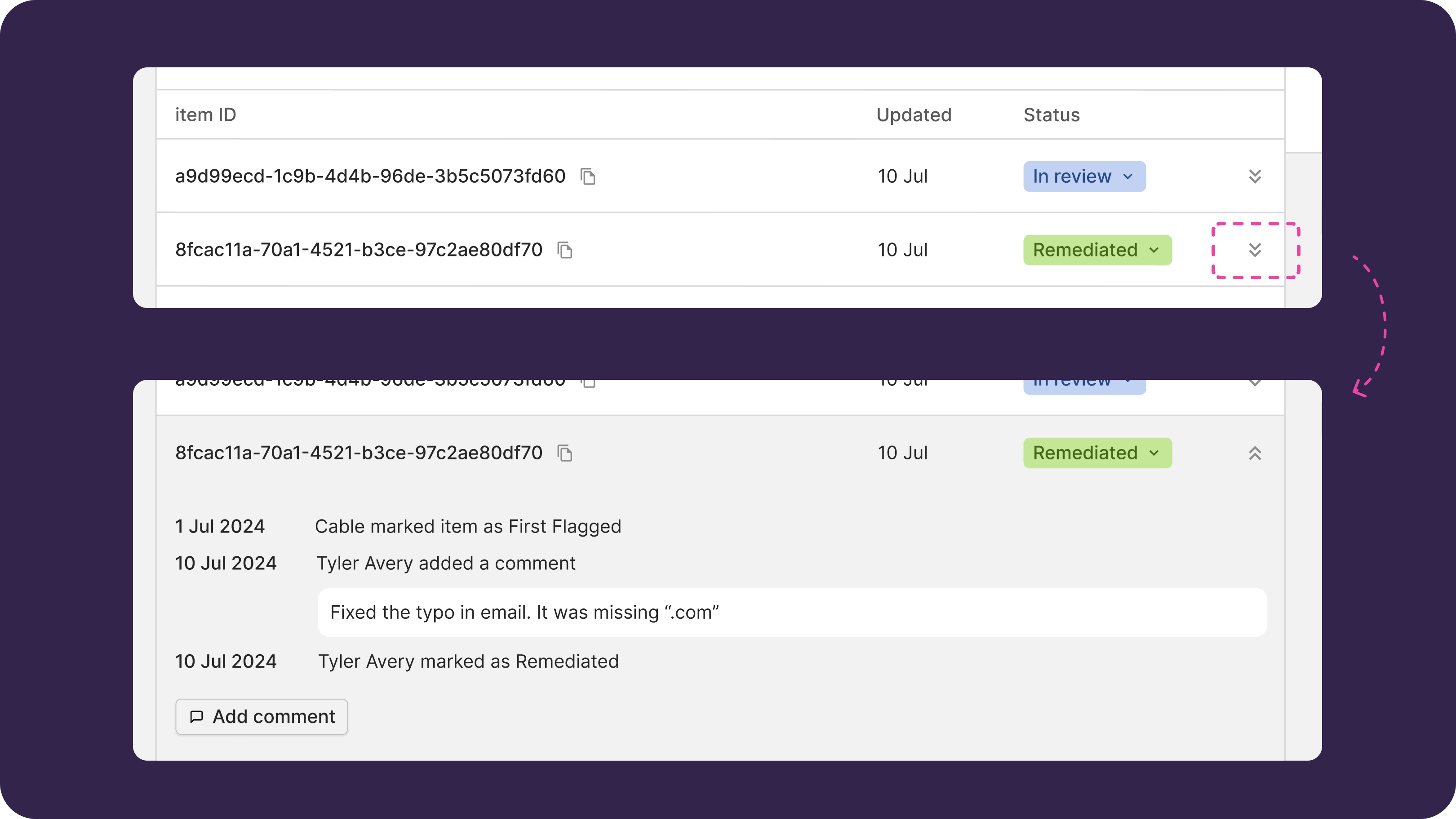 - Expanding a row will show you the entire audit history (when the account was added to the Trail and who updated the status)