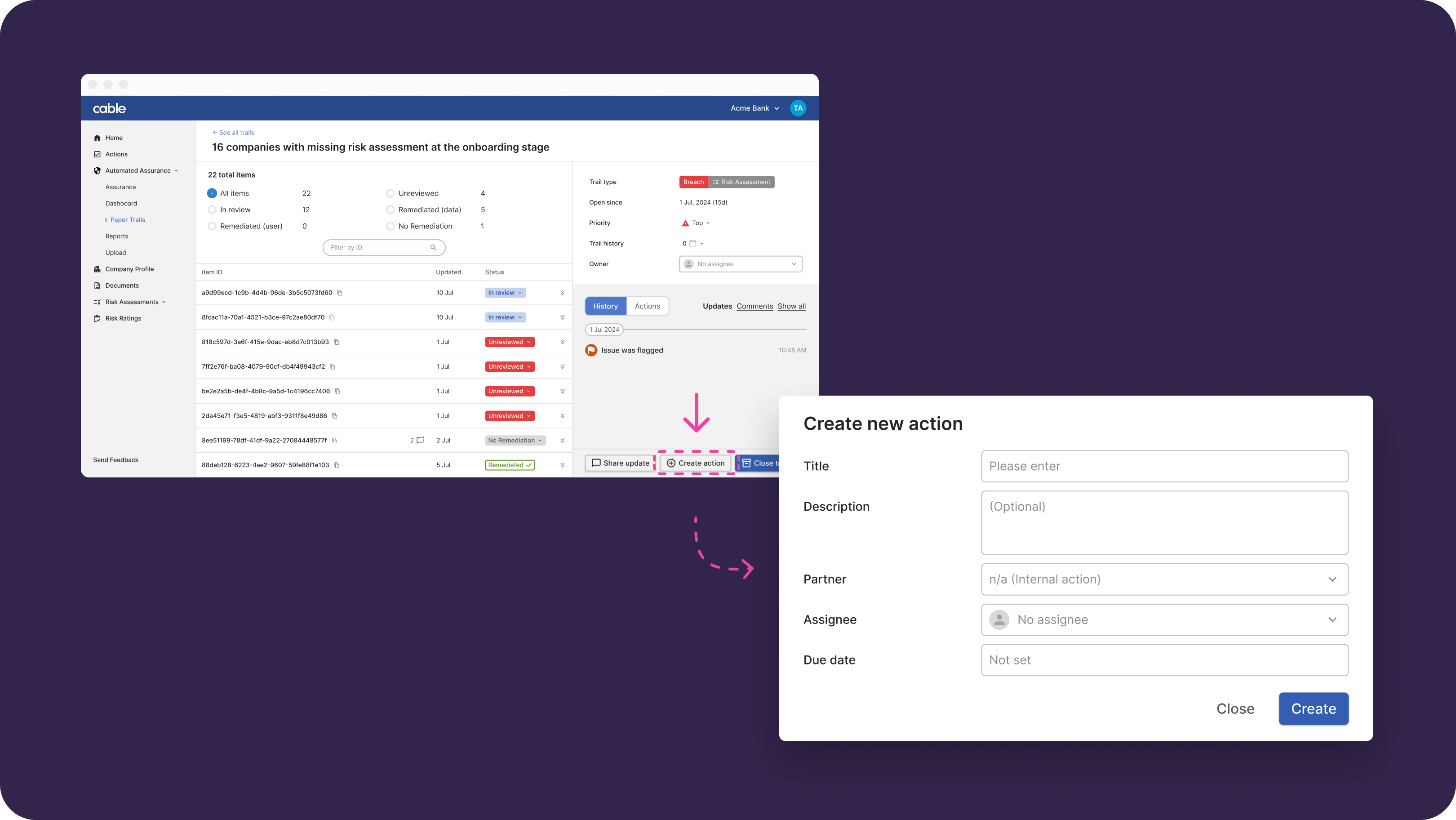 As you’re investigating accounts flagged in paper trails, you can add actions, set a due date, and assign them to yourself or other team members. Actions added across all paper trails will be consolidated in a list on the Actions tab in the left navigation menu.