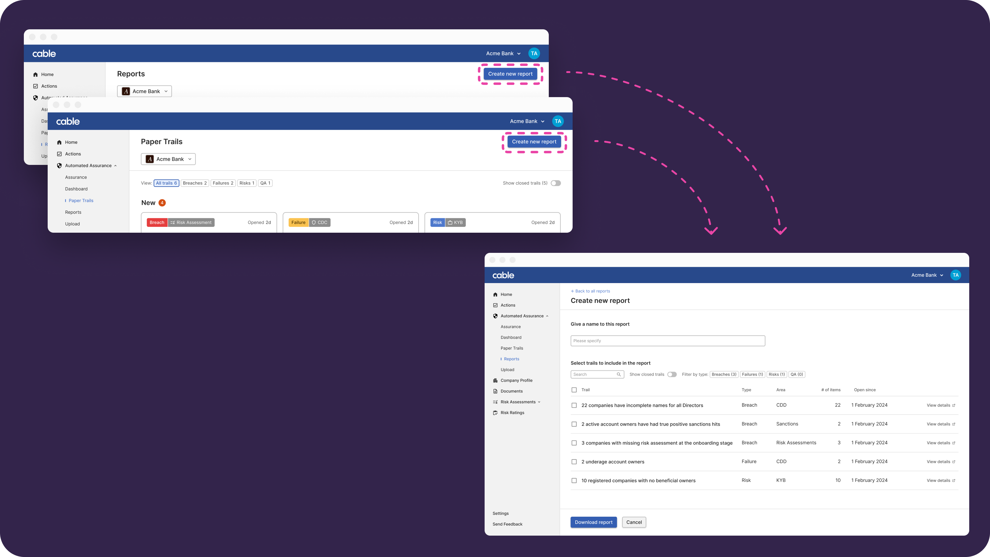 You can create automated reports via Cable by selecting any relevant Trails to add to a Report.