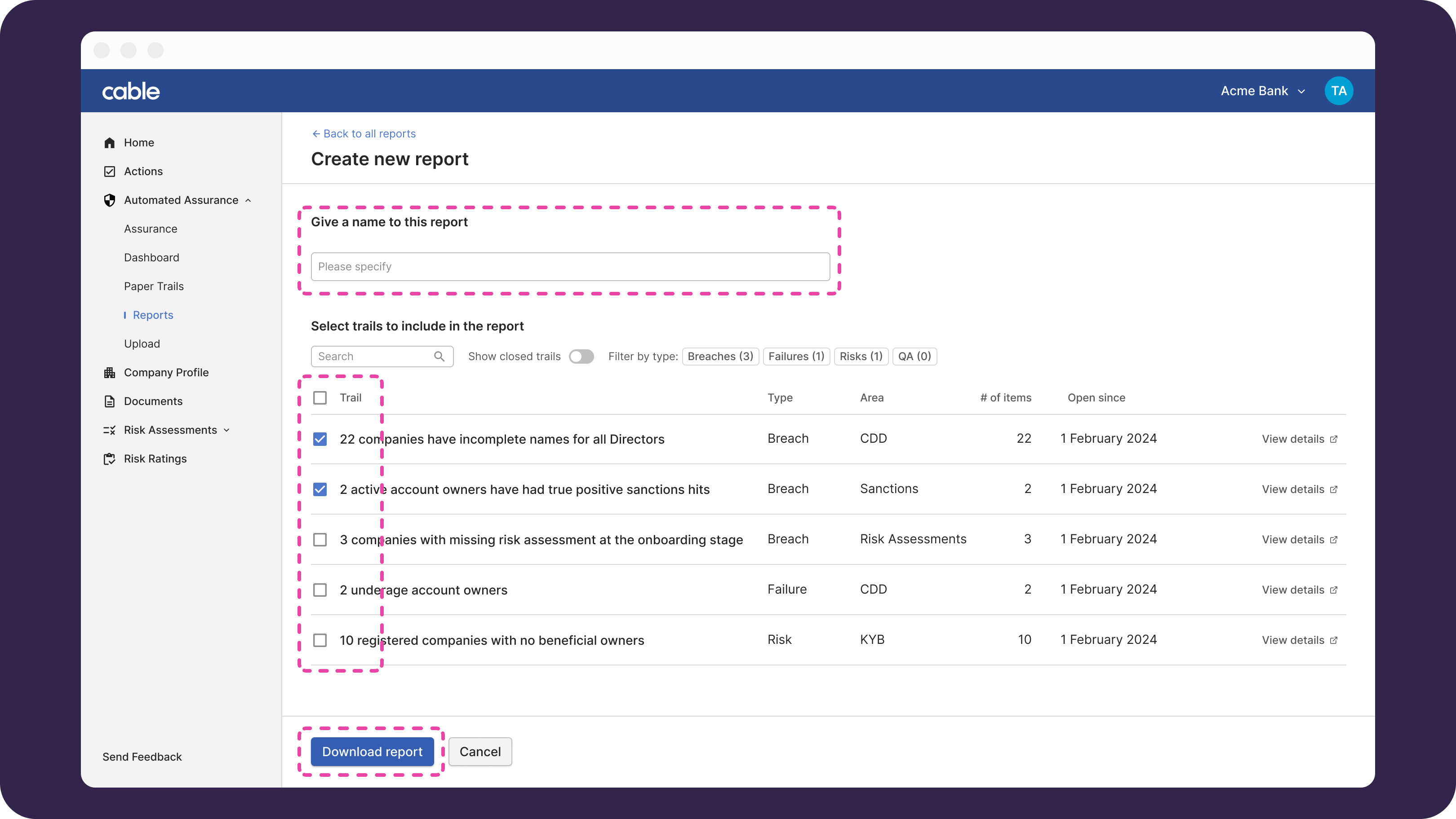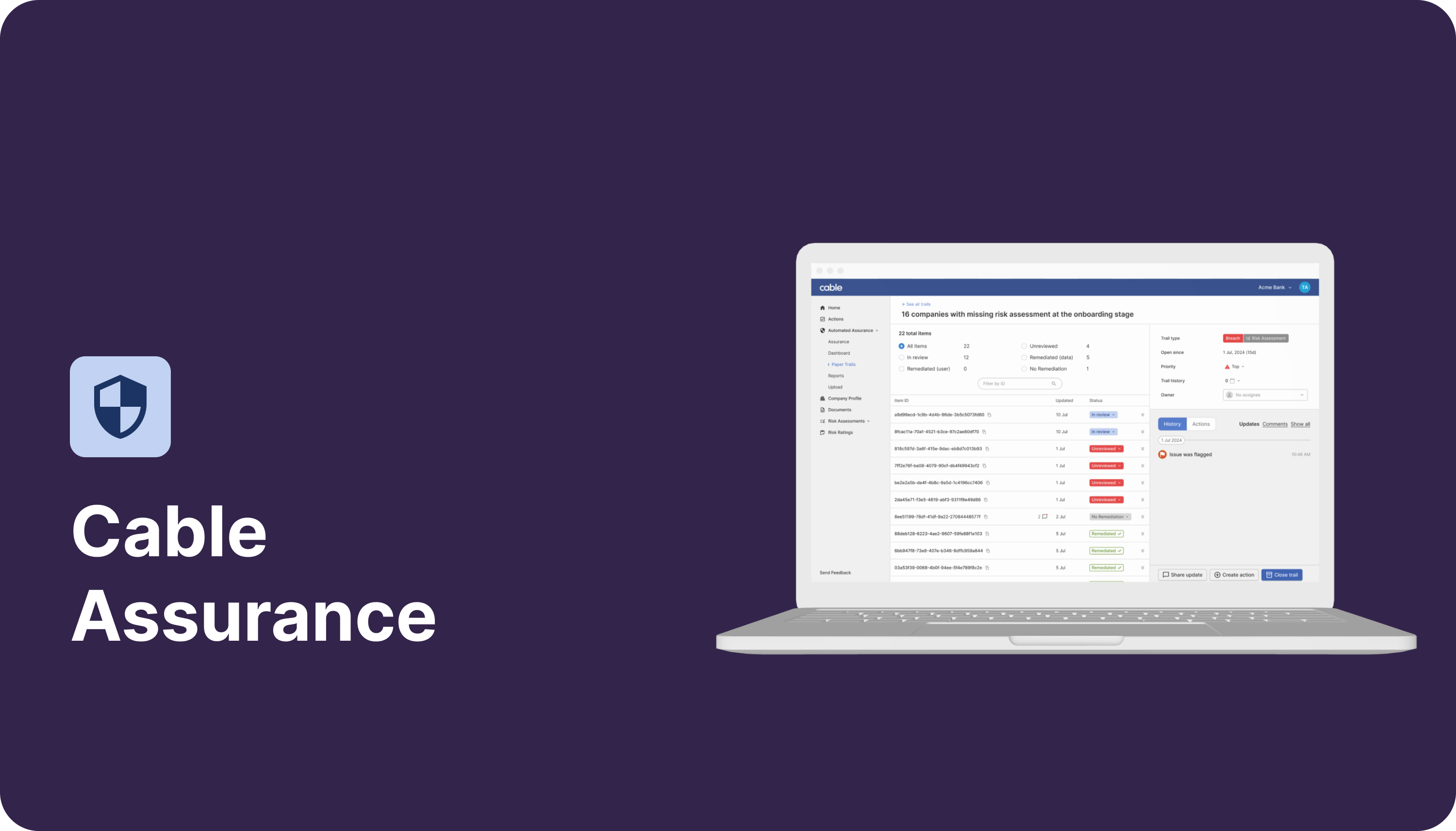 - Breaches: Cable agrees with you in advance on the regulatory requirements your company must adhere to. If we find something in the data that indicates one of those requirements is not being met, we’ll surface a Breach. You can see the full list of requirements Cable is currently offering assurance over in the Assurance page