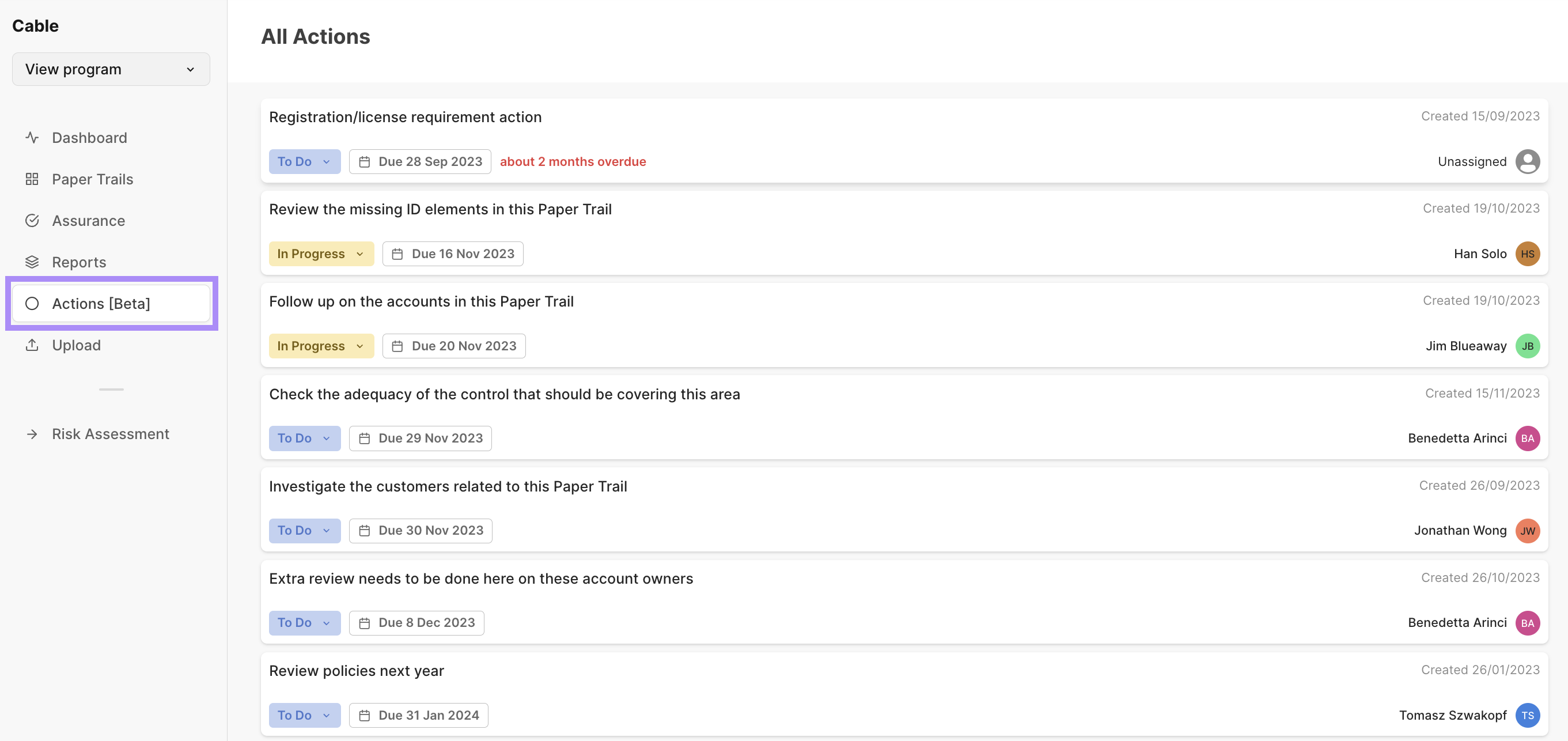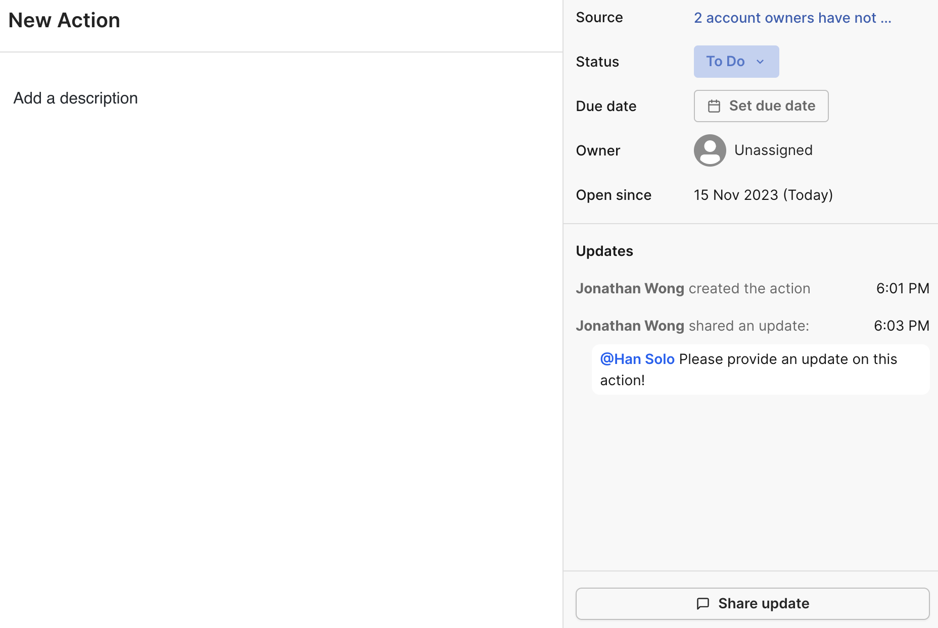 - In the Action page, you can edit the Action name, description, status, due date, and owner, share updates with your team, and see the source Paper Trail for an Action