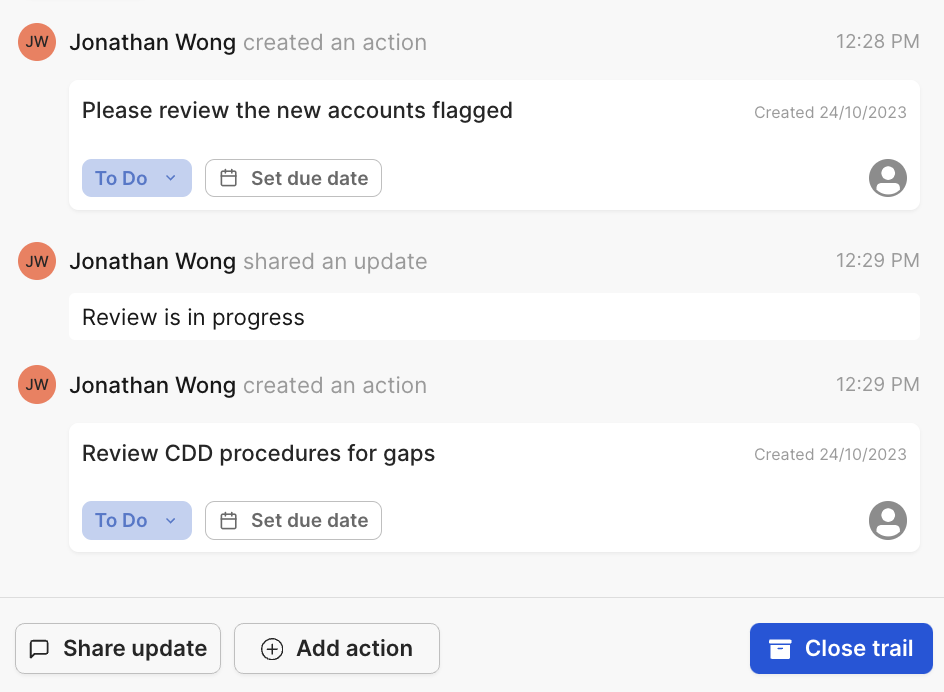 - As you’re investigating an account in a trail, you can add a comment directly to the specific flagged account