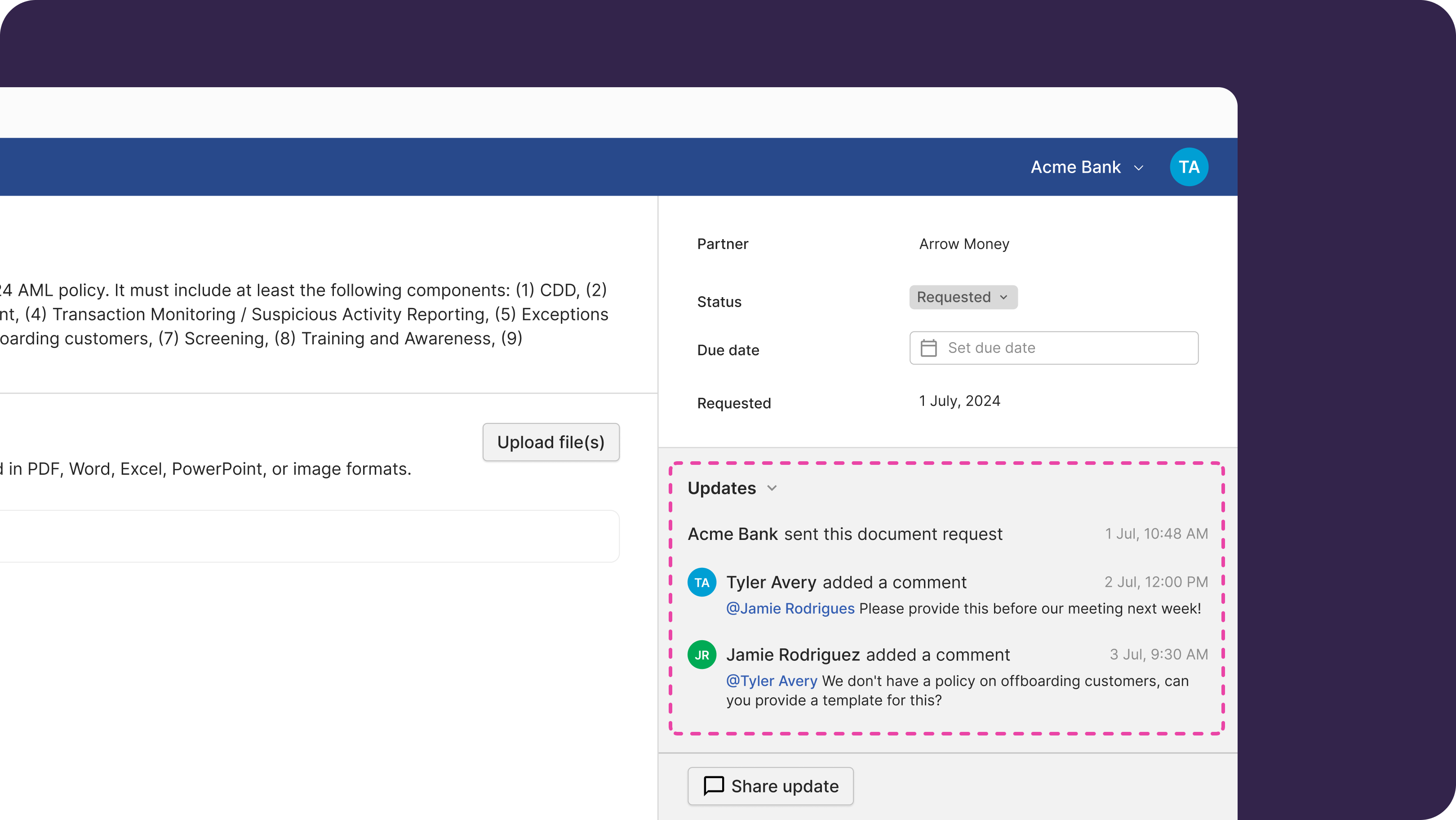 Your partner can upload as many documents as relevant, update status, and notify you when the request is complete.