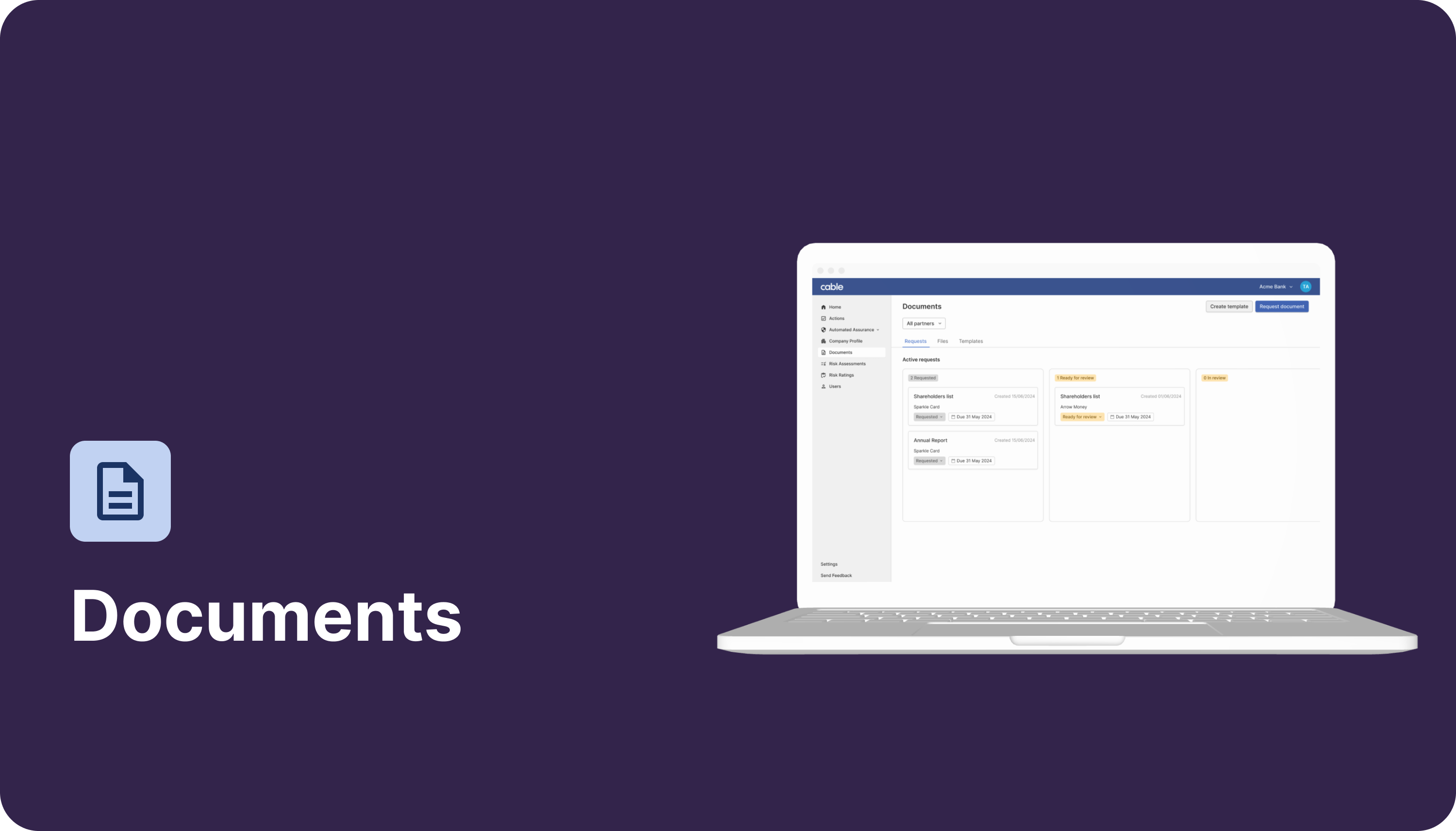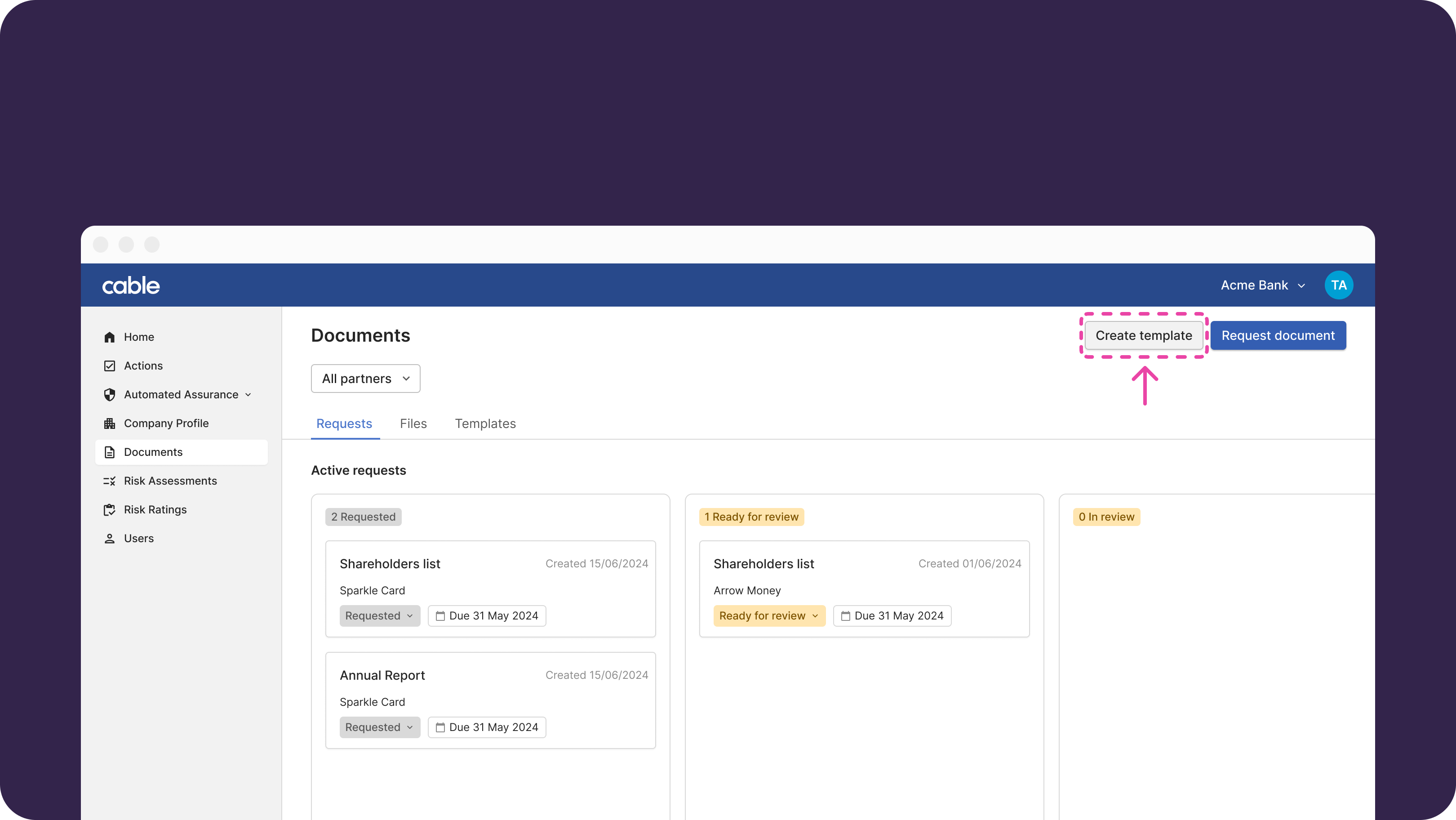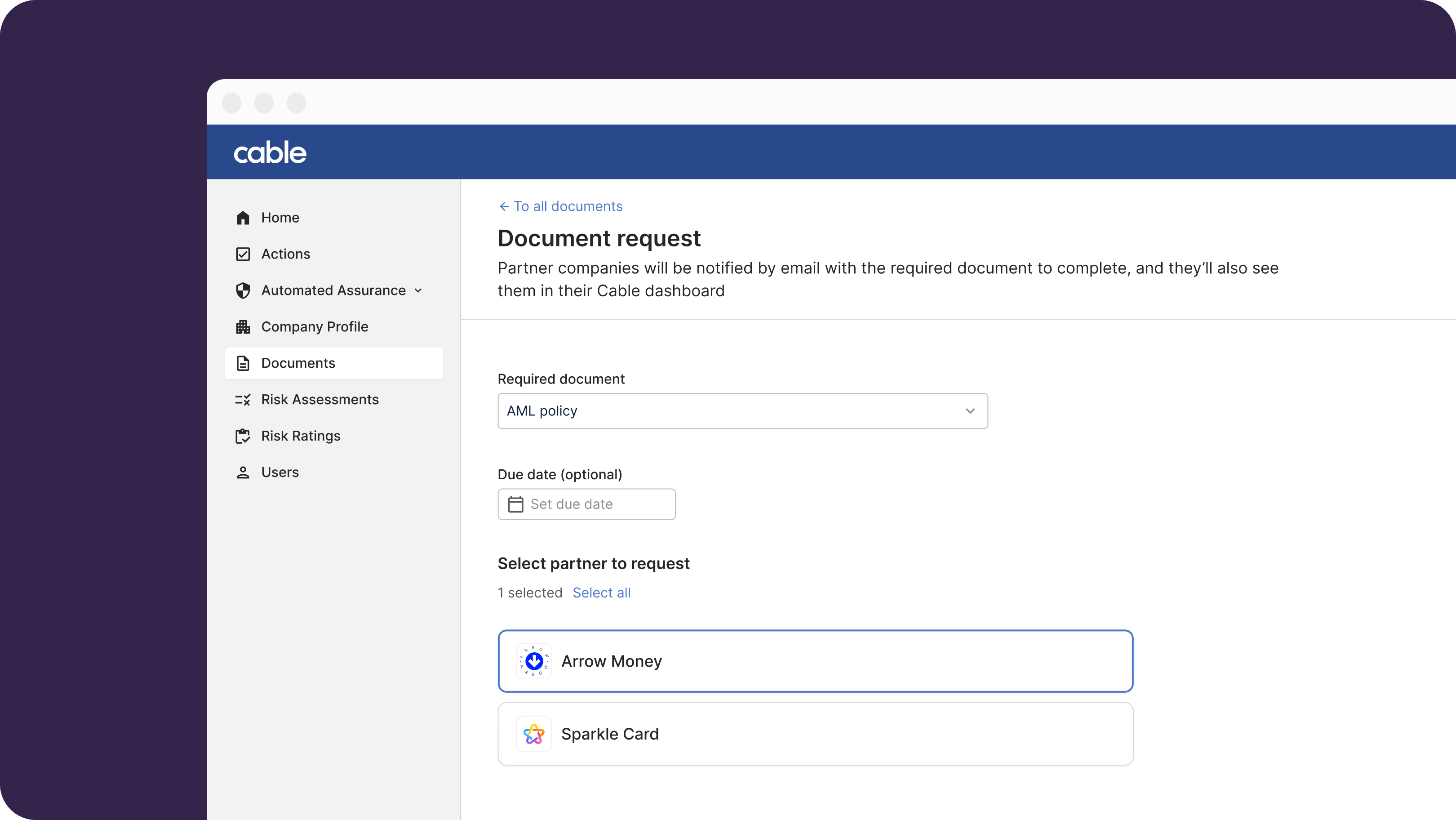 Once you’ve created at least 1 template, you can create a Document Request. You can select any number of partners to send the request to and set due dates.