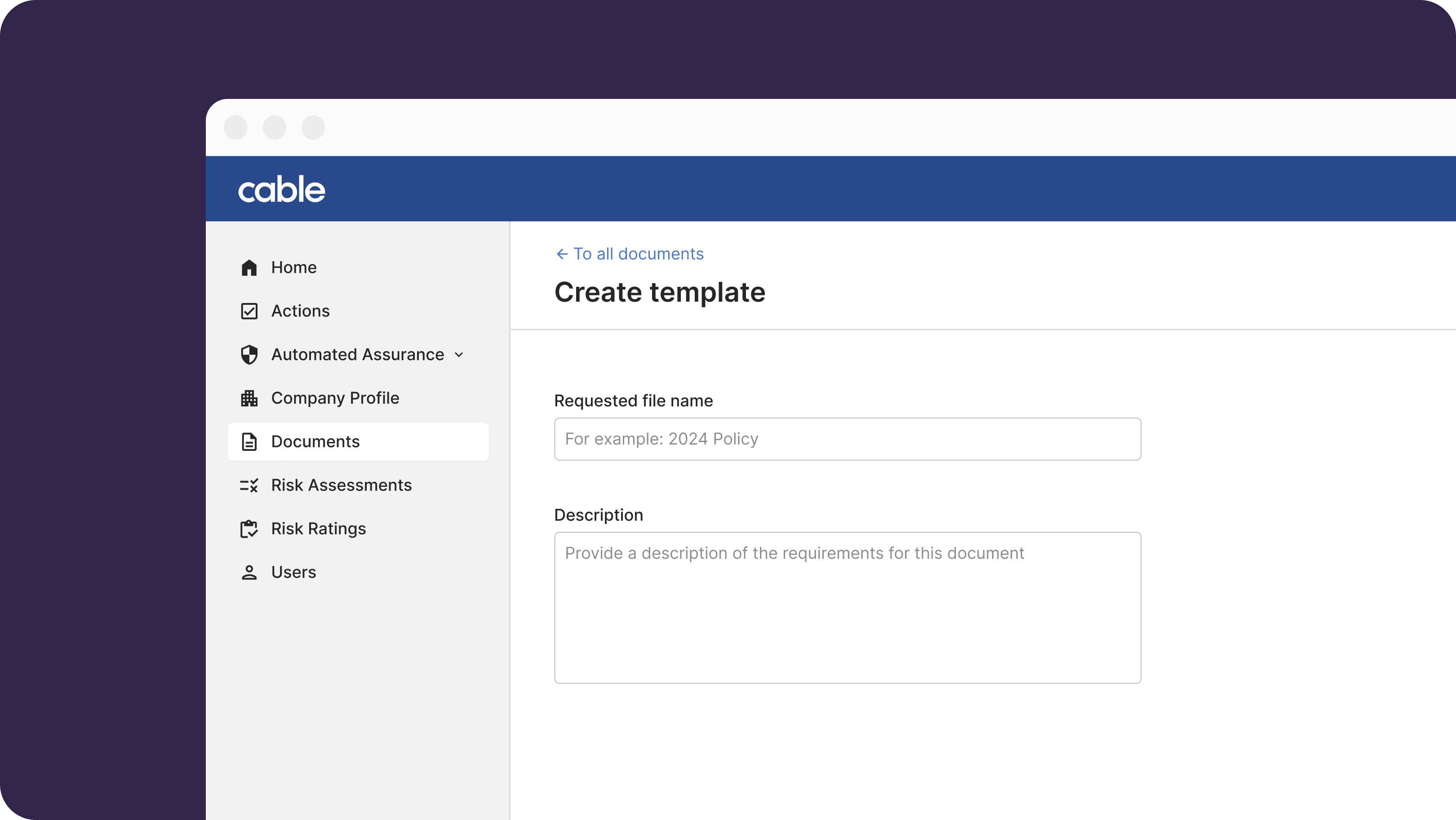 To request a document, you must first create a Template. Select “Create template” and fill in the file name you’d like to appear as well as the description.