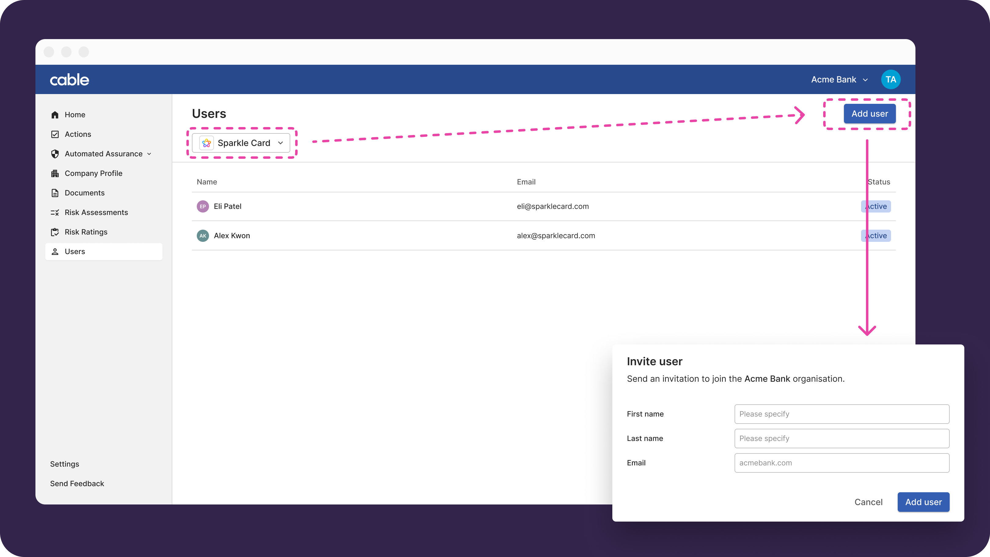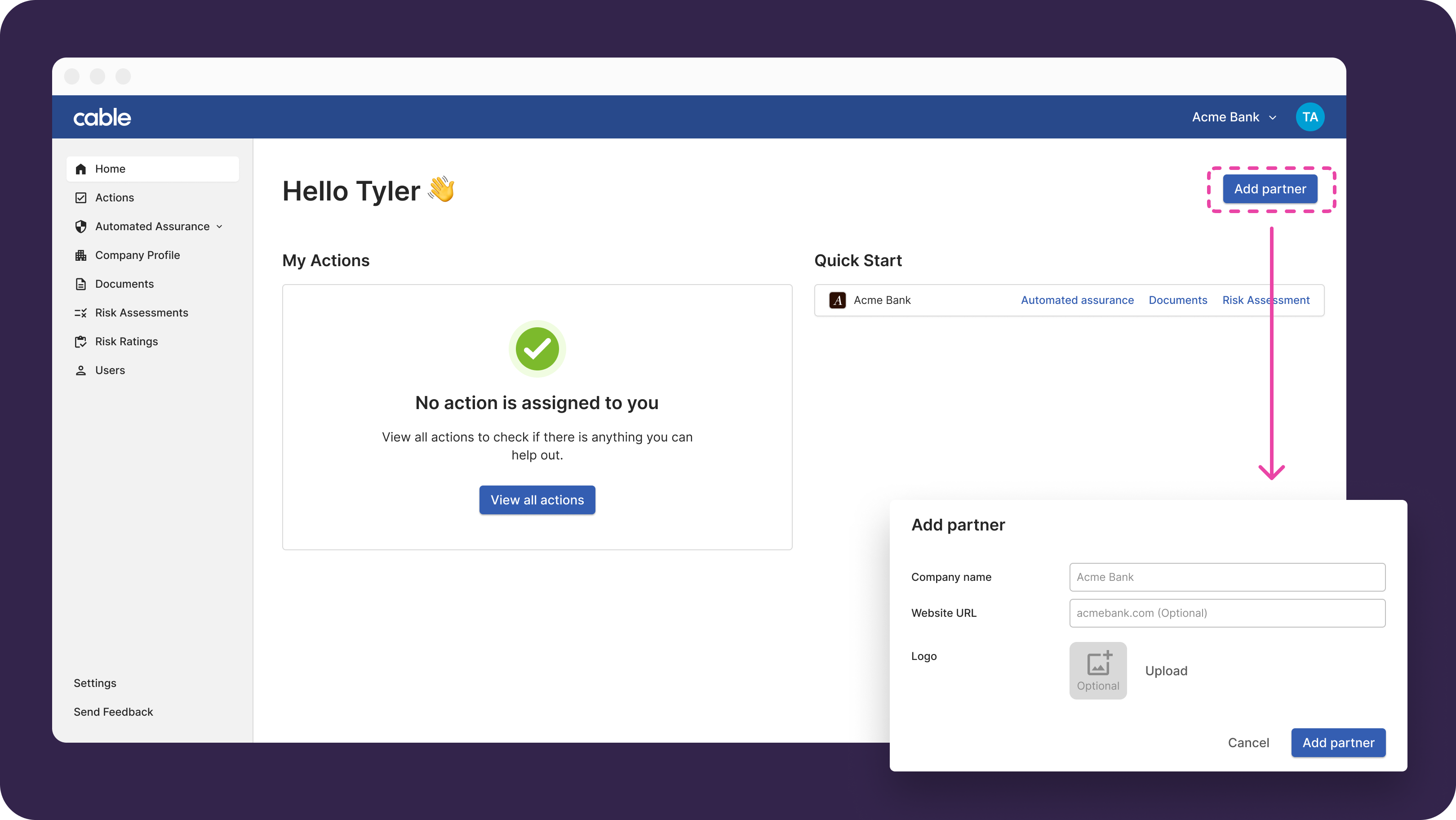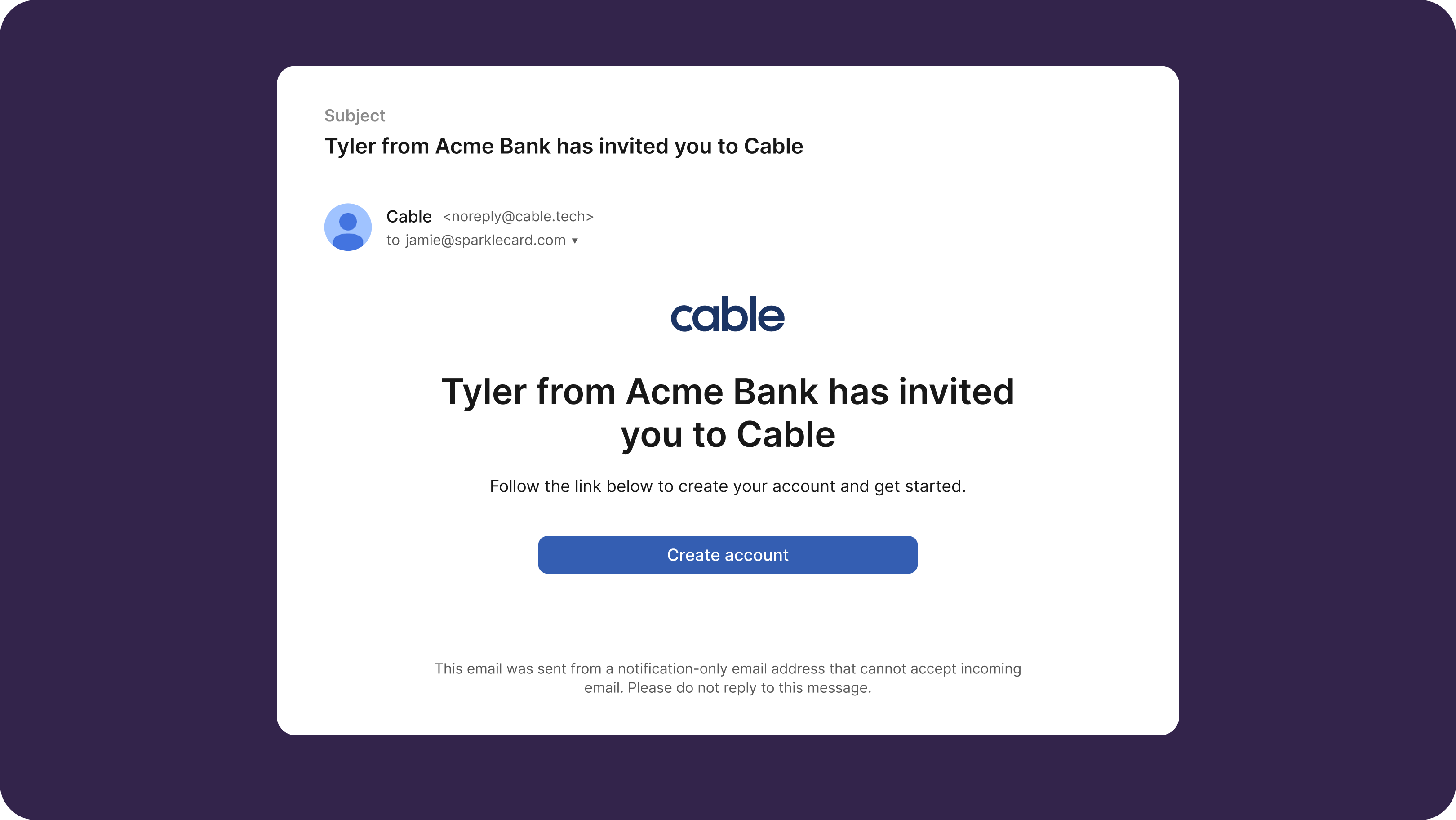 After adding a partner, you’ll be directed to invite the partner to collaborate in Cable. This is an optional step - if you aren’t ready to invite any specific users, you can come back to this stage later.