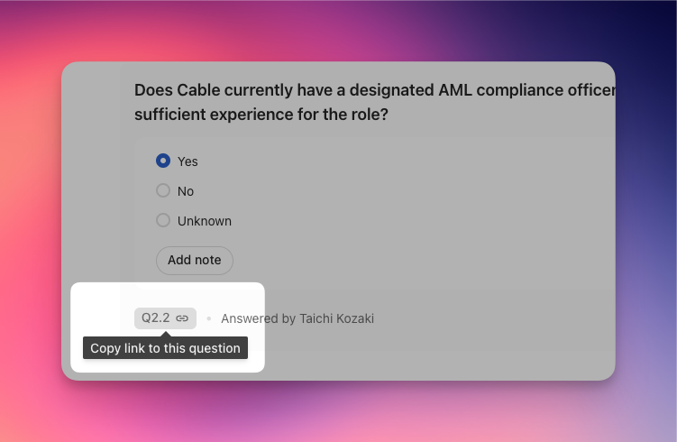 When working with a risk assessment questionnaire, you can now deep link to a specific question. This will allow you to share a link to a specific question with your team.